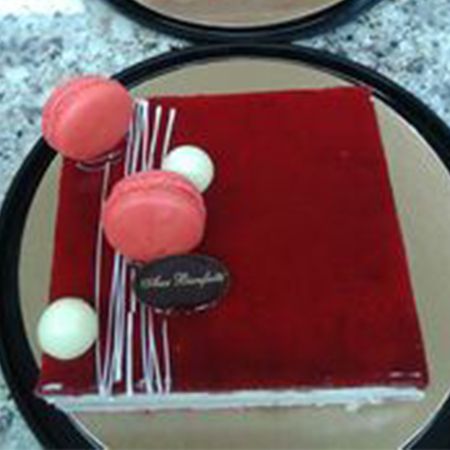 Crème mousseline aux framboises et mousseline à la vanille, étagées de biscuits vanillés aux amandes recouvert d’un savoureux miroir aux framboises et de savoureux macarons. Pour une touche rafraîchissante et fruitée.