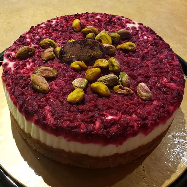 Traditionnel gâteau au fromage style New-York, recouvert de framboises et de pistaches. Une belle découverte.