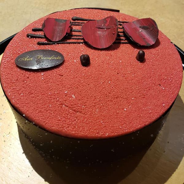 Mousse au chocolat noir à base de purée de framboises, gelée de framboises sur un biscuit au cacao le tout recouvert d’un effet velours rouge.
