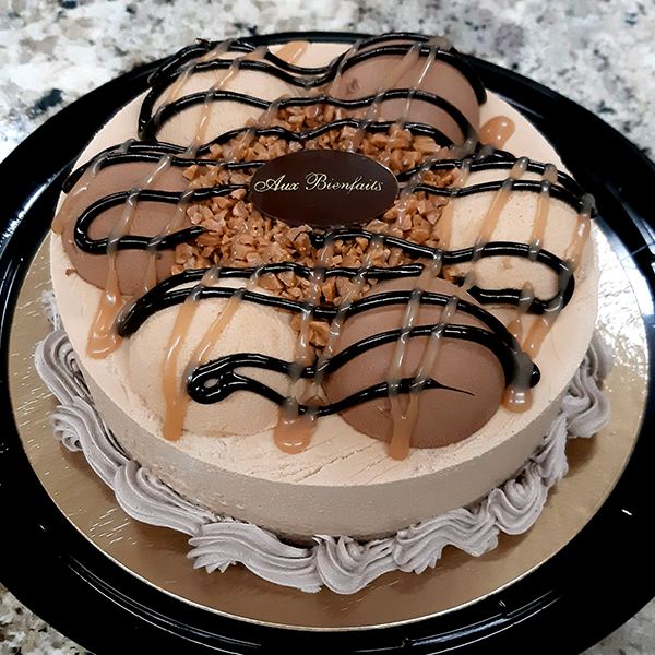 Mousse au caramel et mousse au chocolat noir sur une génoise au cacao décoré d’éclats de caramel et de chocolat avec coulis chocolat-caramel. Hummmm!